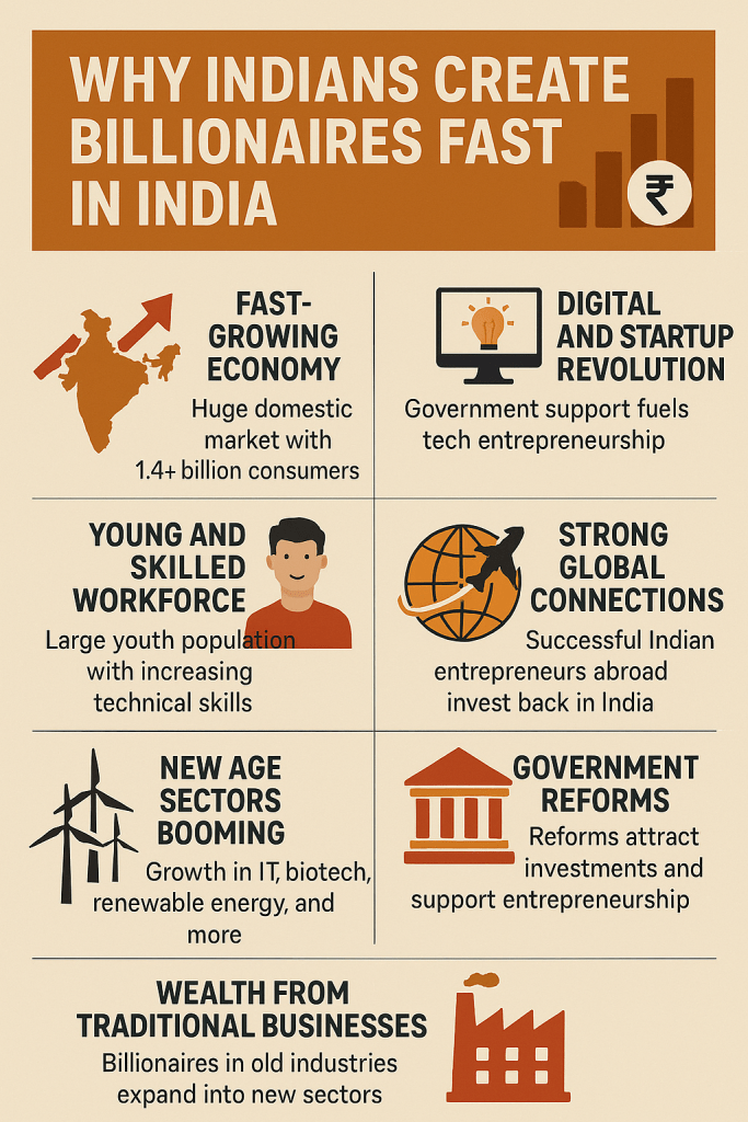 Indians are creating billionaires fast in India due to a combination of economic, demographic, and technological factors. Here’s a clear explanation of why:—