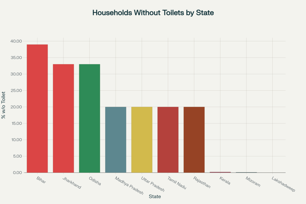 Interventions under the Swachh Bharat Mission and other programs have dramatically increased access to toilets, but gaps remain, particularly in the poorest and most rural states.