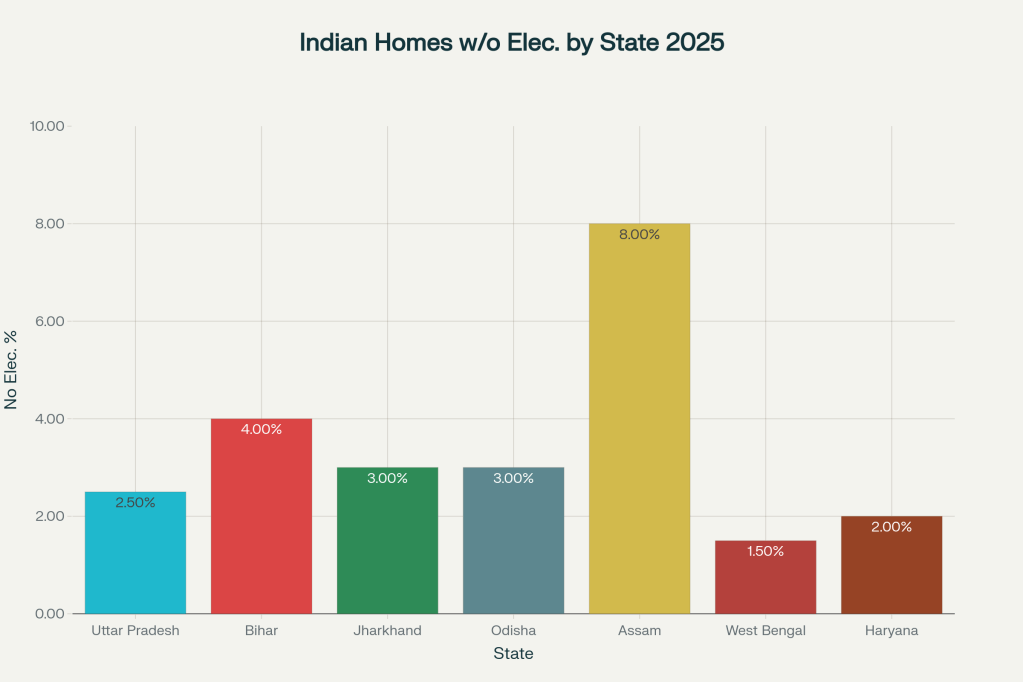 | Assam | ~8% rural homes without electricity (2021) | Marked improvement, but rural regions still lag[1][2]. |