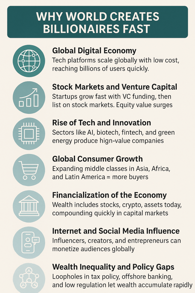 The world creates billionaires faster today due to a combination of technology, globalization, financial innovation, and market access.