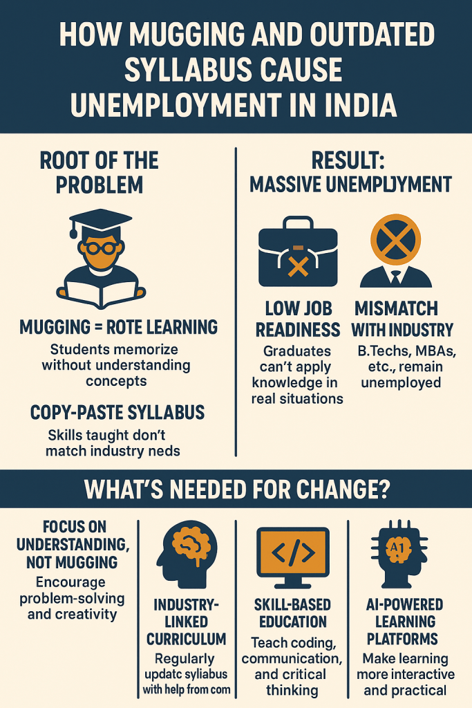 2. Mismatch with Industry B.Techs, MBAs, and other graduates often remain unemployed because their skills are not relevant.AI and automation are replacing repetitive jobs, but students aren’t trained for creative, analytical roles.