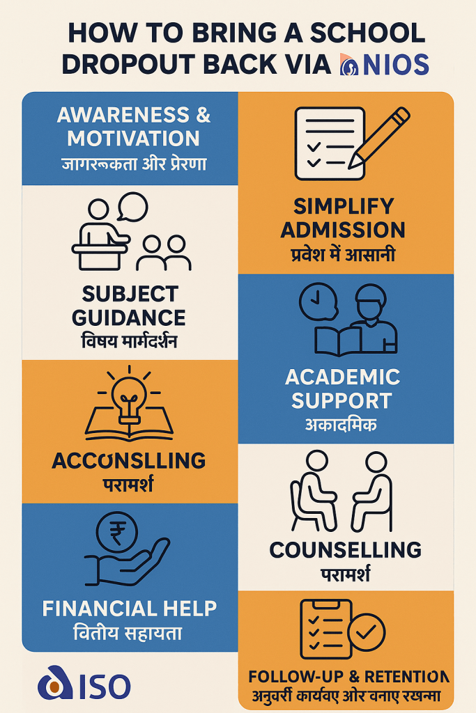 Helping school dropout students join and succeed in an NIOS (National Institute of Open Schooling) course in India requires a mix of awareness, guidance, and continuous support, because many dropouts lack information, resources, or confidence to rejoin the education system.