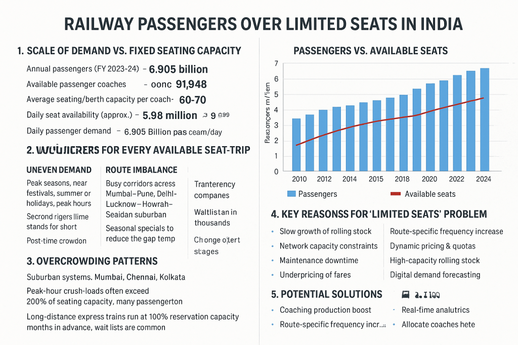 Here’s a clear, numbers-backed analysis of passengers vs. limited seats in Indian Railways, showing why overcrowding is so common and how the mismatch plays out.
