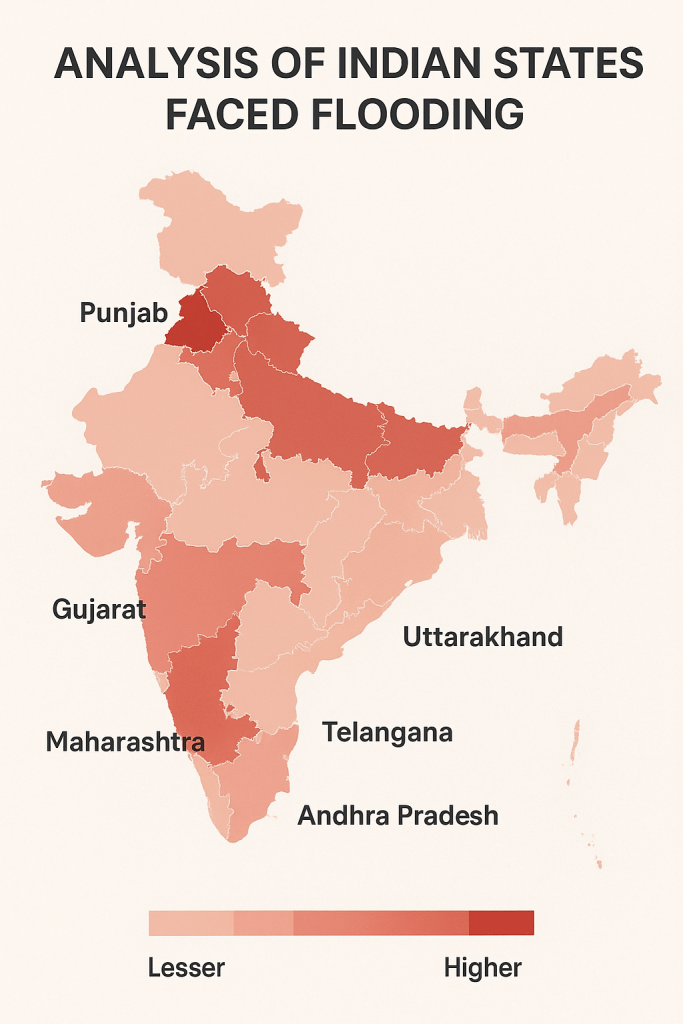 Many Indian states faced flooding due to a combination of extreme rainfall, river overflow, inadequate drainage, climate change, and unplanned urbanization, with pronounced effects during the 2025 monsoon season.
