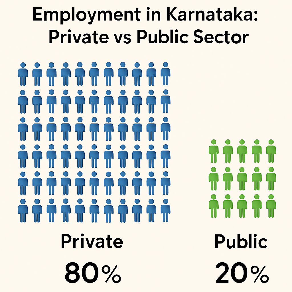 Karnataka’s private sector dominates formal job creation due to tech hubs (Bengaluru), industrial policies, and large investments in manufacturing and service sectors.The working population engaged in non-agriculture is about 1.59 crore most are in private sector roles.