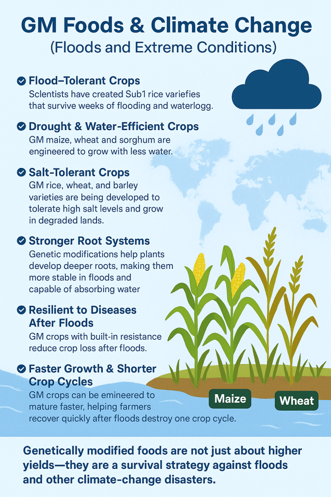 ✅ In short: Genetically modified foods are not just about higher yields—they are a survival strategy against floods and other climate-change disasters.