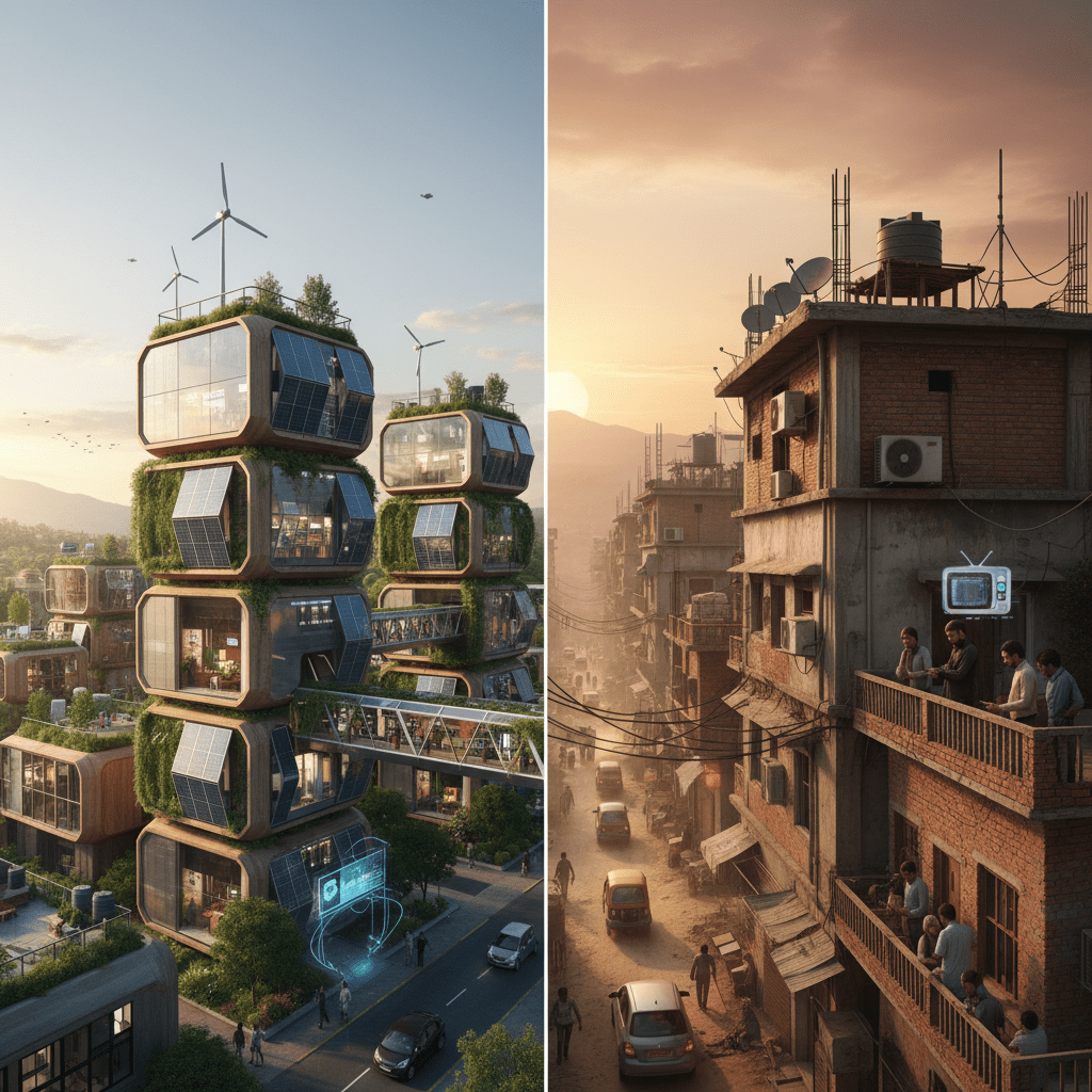 Next generation real estate in India is rapidly adopting smart technologies, sustainable practices, modular construction, and advanced customer-centric models—whereas current building stock primarily relies on conventional materials, manual labor, slower construction workflows, and less tech-driven transparency.