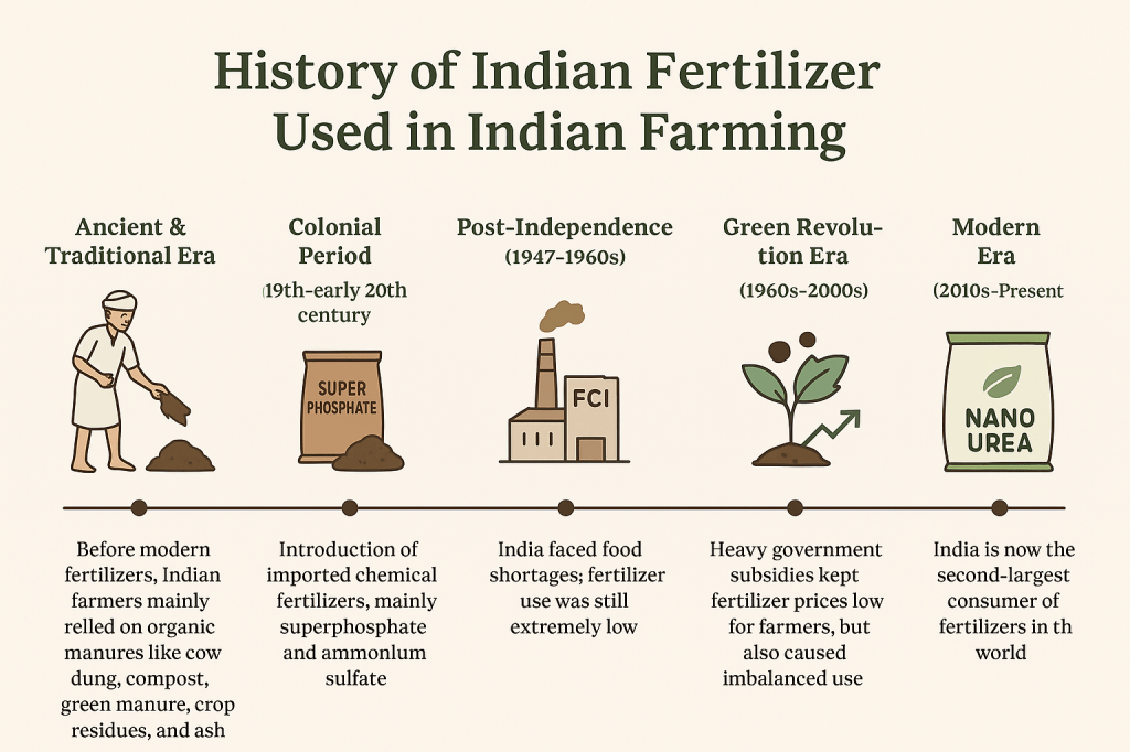 India’s fertilizer history evolved from organic manures (ancient era) → imported chemicals (colonial era) → government factories (post-independence) → Green Revolution boom → subsidy-driven expansion → modern innovations like nano-urea and bio-fertilizers.