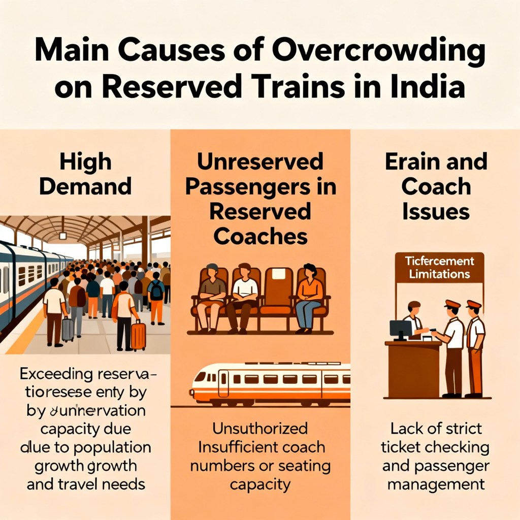 The main causes of overcrowding on reserved trains in India are:High Demand vs Limited Capacity: Passenger demand for train travel far exceeds the available seating capacity on many popular routes. The number of coaches is often limited due to platform length restrictions and infrastructure constraints, leading to insufficient seating for reserved passengers �.