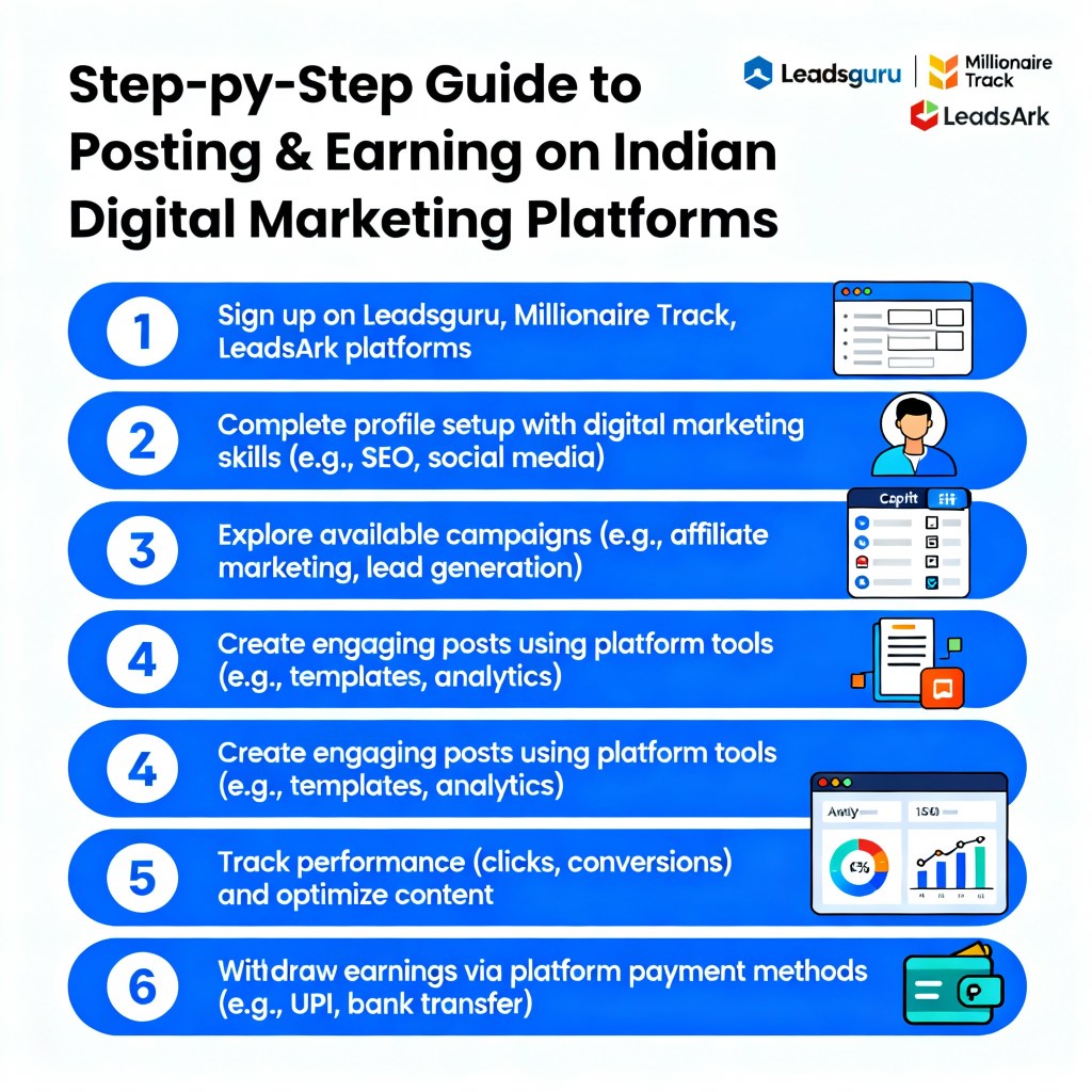 To earn income step by step using Indian digital marketing platforms that are alternatives to Bizgurukul, use platforms such as Leadsguru, Millionaire Track, LeadsArk, and IDigitalpreneur, which provide structured affiliate programs and skill-based earning opportunities specifically for Indian creators and marketers����.