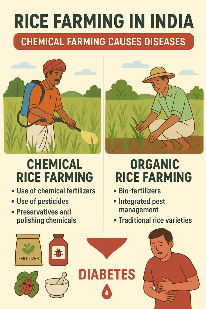 While rice exports strengthen India’s economy, chemical farming threatens public health and soil fertility. Moving toward organic and sustainable rice production can protect both people and the planet — ensuring that India remains the world’s rice bowl without harming its own population.