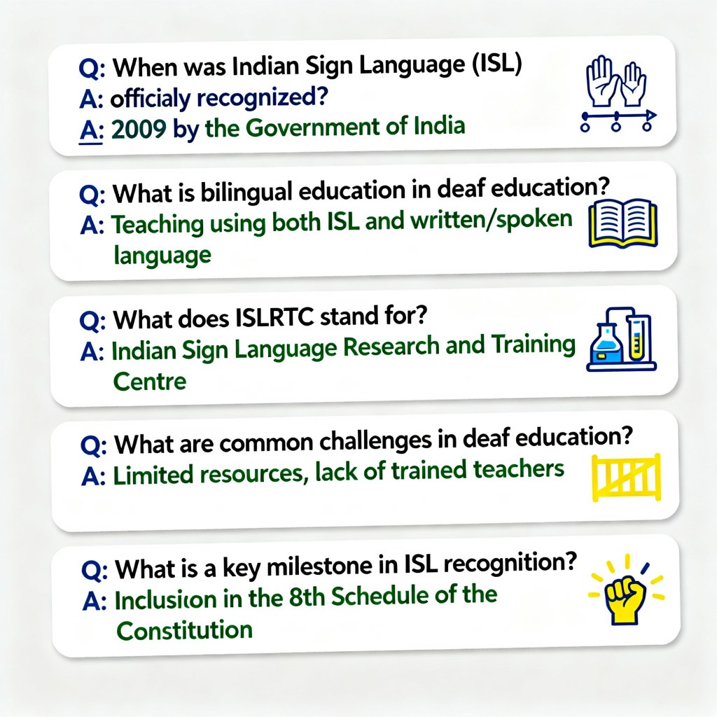 These flashcards cover history, key institutions, teaching challenges, and cultural aspects of Indian Sign Language in deaf education. They can be used for study or training purposes. If needed, they can be formatted as printable cards or digital flashcards for apps.This selection reflects the unique Indian context of deaf education with ISL as a medium, highlighting ongoing challenges and progress ����.