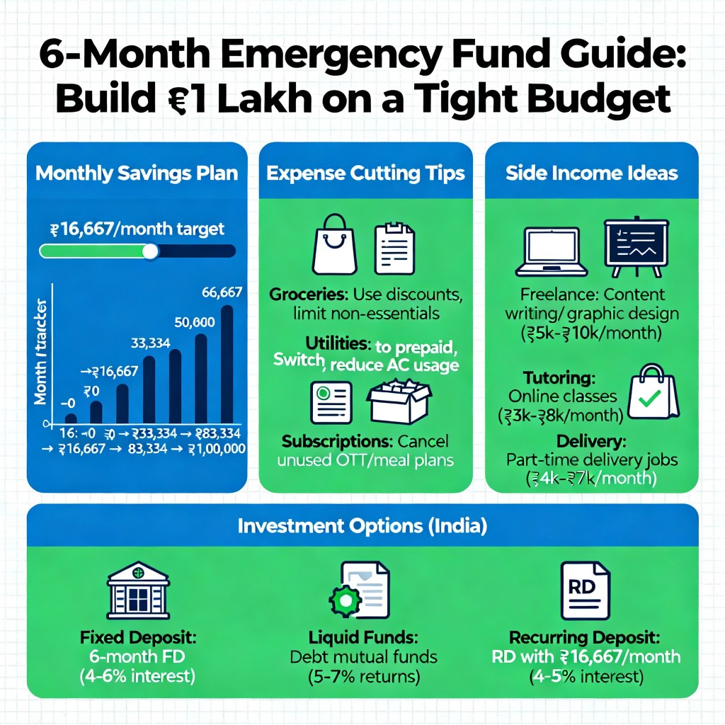 Building a ₹1 lakh (or ₹1,000 equivalent) emergency fund in six months on a tight budget is entirely achievable with consistent planning, cost control, and smart micro-investments. Following recent 2025 financial advisories from Indian platforms and banks, here is a practical roadmap.