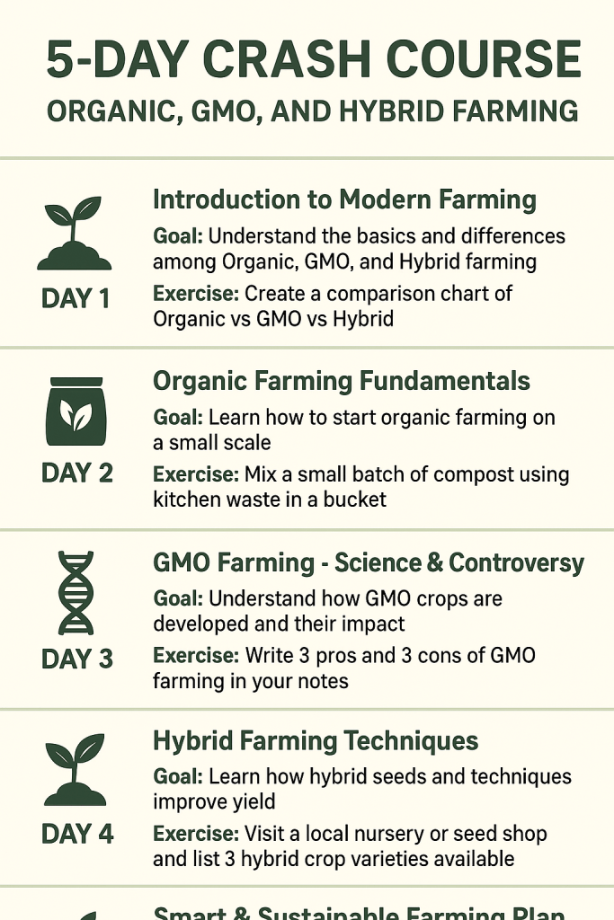Here’s a 5-day crash course to quickly learn Organic, GMO, and Hybrid Farming — perfect for beginners who want a practical understanding of modern agriculture methods.—