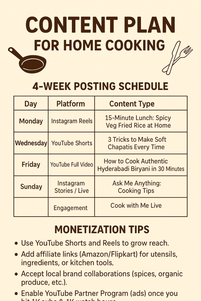 Home cooking content performs very well on both YouTube and Instagram, especially when you blend creativity with consistency. Here’s a complete content plan designed for growth and monetization 👇—