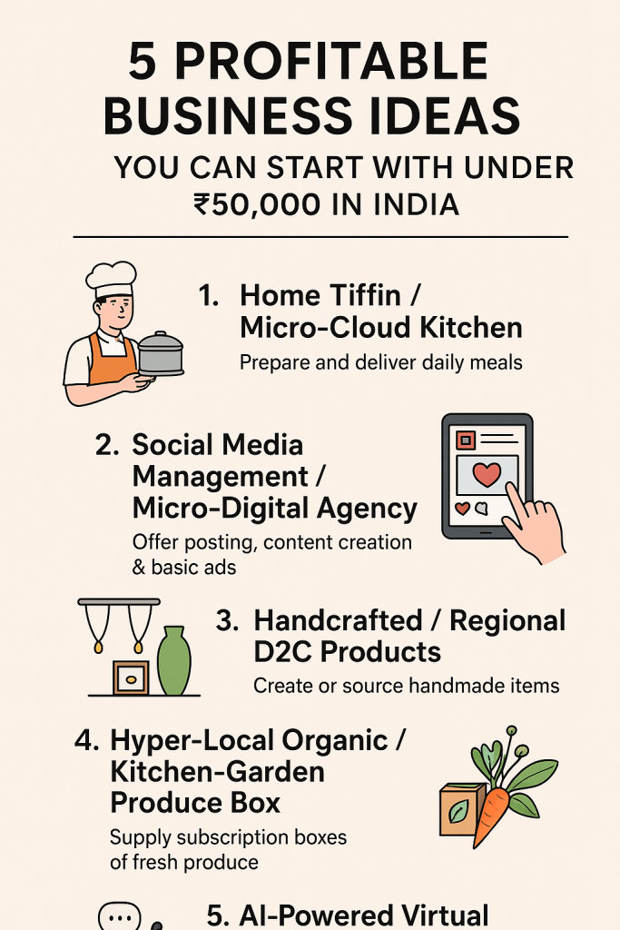 Here are 5 profitable business ideas under ₹50,000 in India, in brief: