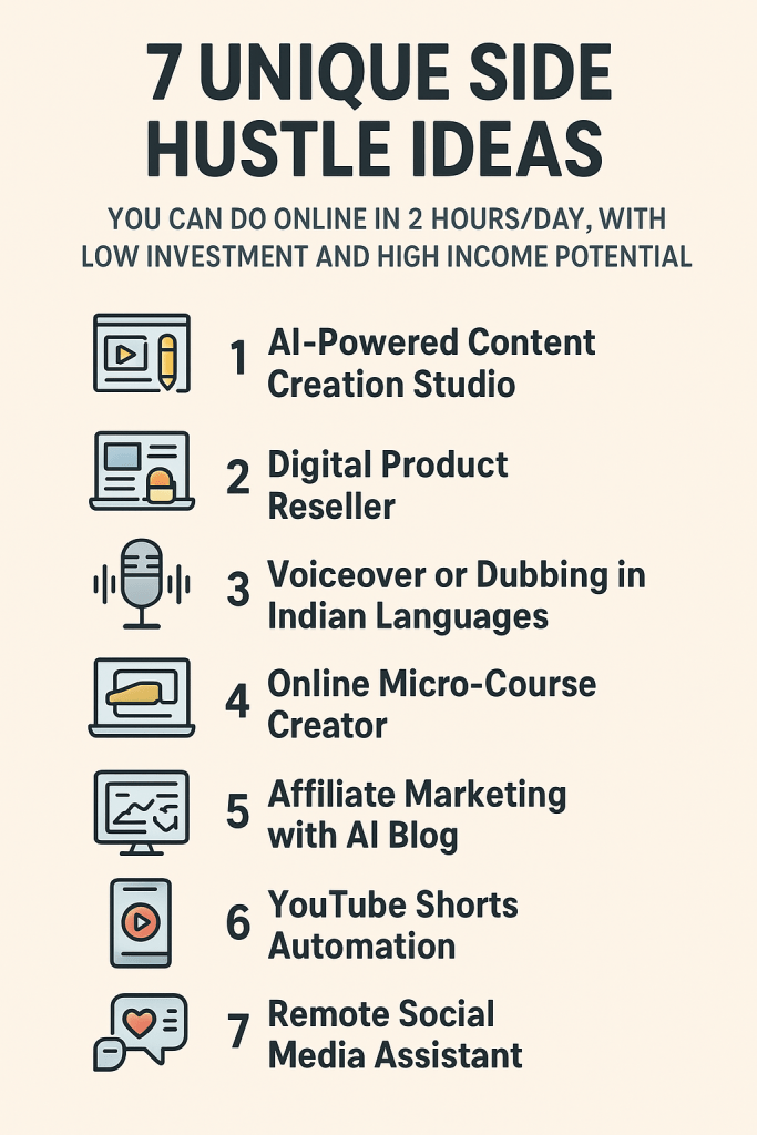 Here are 7 unique, high-potential online side hustles you can do with just 2 hours a day and minimal investment (under ₹10,000) — all practical for Indian or global markets in 2025 👇—