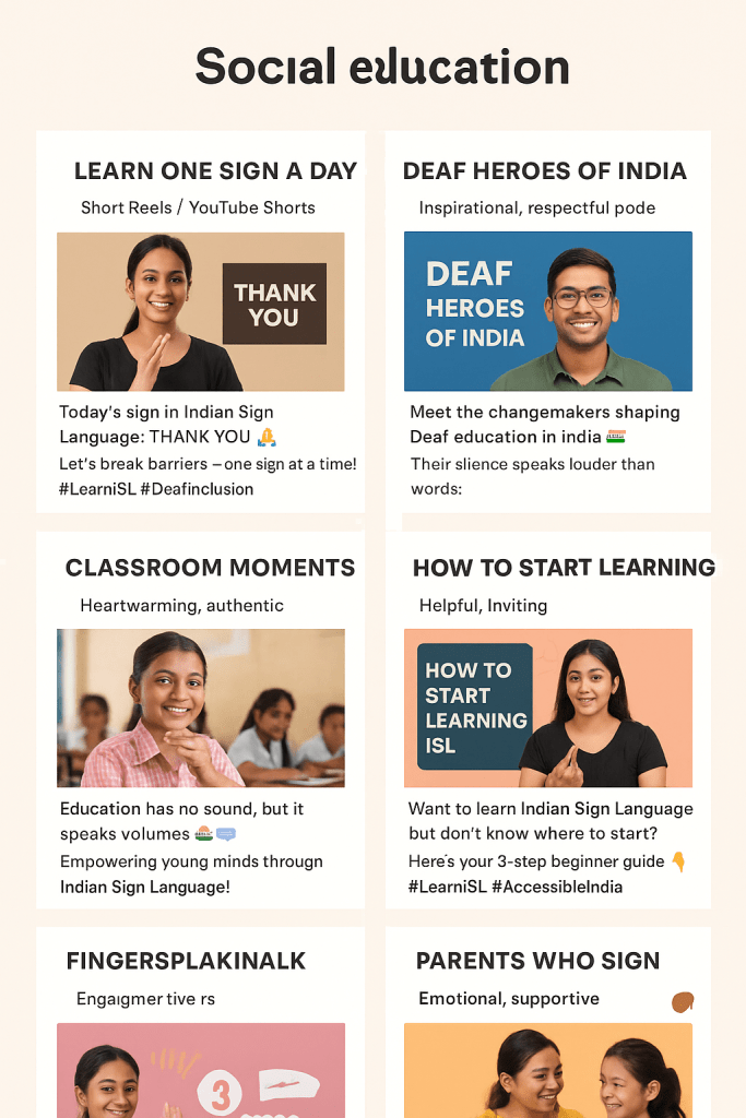 Here are 7 social media post ideas about Deaf Education using Indian Sign Language (ISL) — each with suggested tone, format, and caption ideas to help you create engaging, inclusive content 👇—
