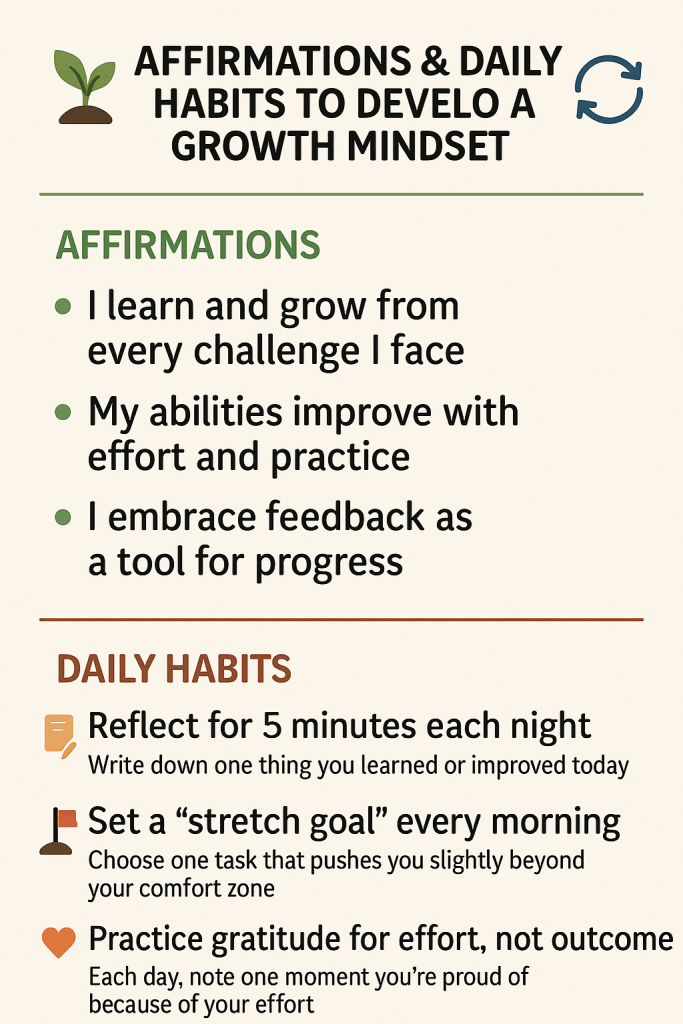 Here are 3 affirmations and 3 daily habits to help you cultivate a growth mindset — one that thrives on learning, effort, and resilience: