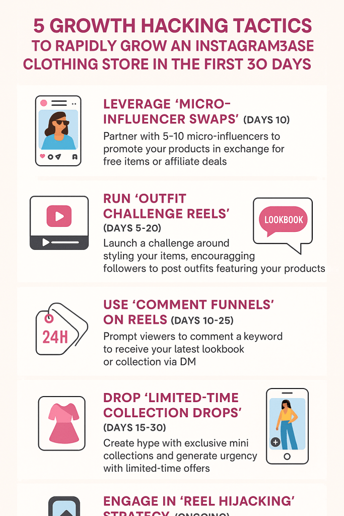 Here are 5 powerful growth-hacking tactics to rapidly grow your Instagram-based clothing store in the first 30 days — even with a small budget 👇—