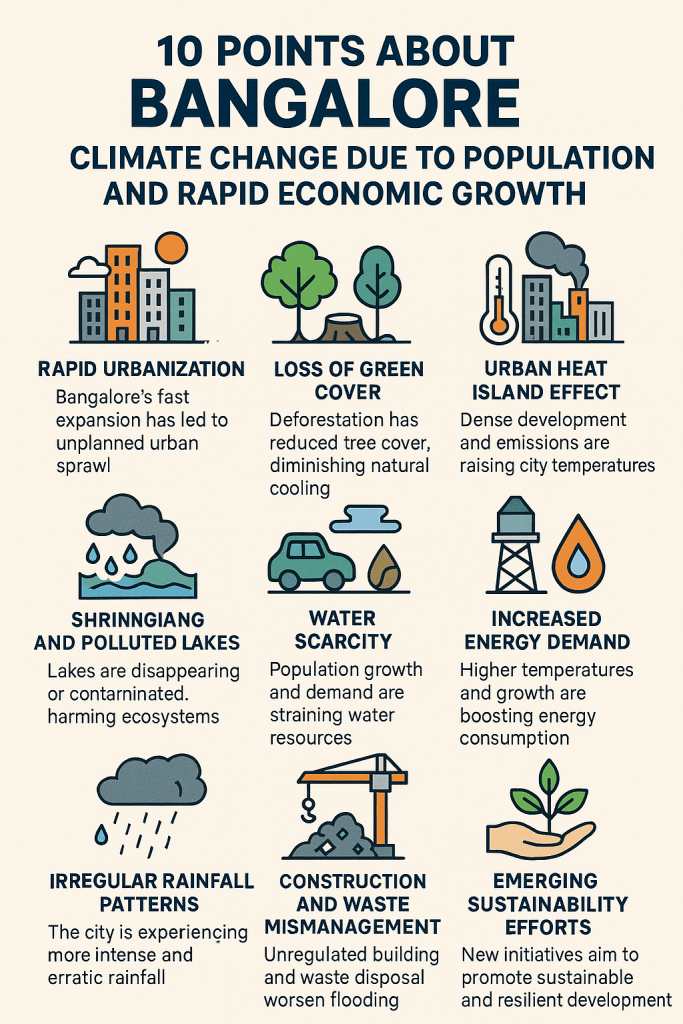Here are 10 key points about how Bangalore (Bengaluru) is experiencing climate change impacts due to population growth and rapid economic development:—
