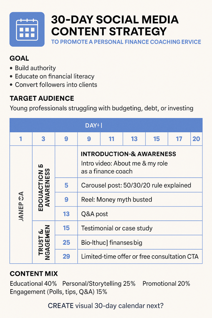 Here’s a brief 30-day social media content strategy for promoting a Personal Finance Coaching Service on Instagram & LinkedIn