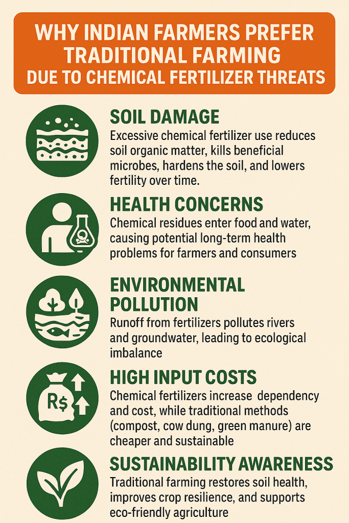 Analysis: Why Indian Farmers Prefer Traditional Farming Due to Chemical Fertilizer Threats Many Indian farmers are gradually returning to traditional or natural farming methods because long-term use of chemical fertilizers has created multiple threats. These concerns influence their shift toward organic or low-input practices.—