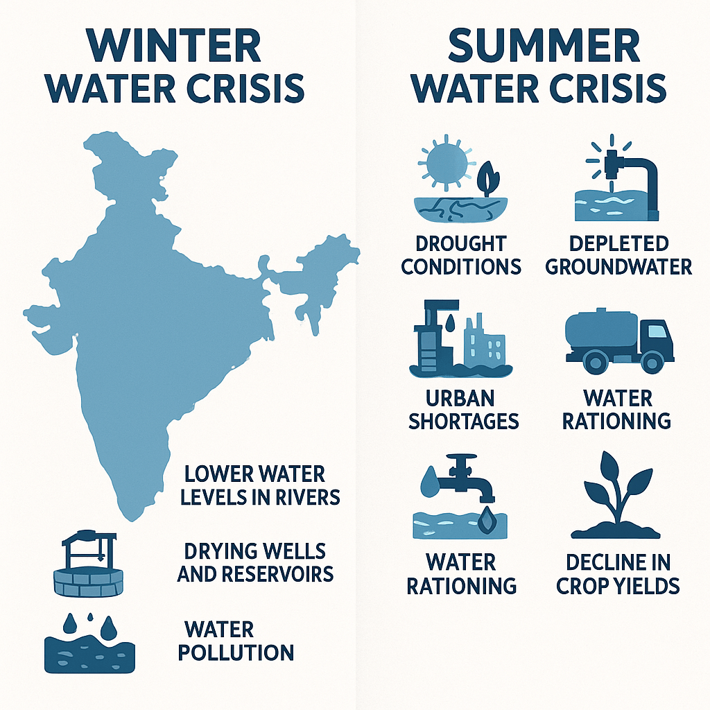 Here is a clear, concise summary of the Indian water crisis during winter and summer:—