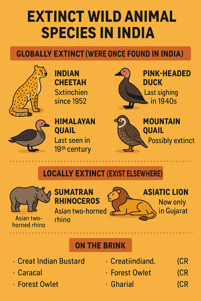 India has lost several wild animal species over the past centuries due to habitat loss, hunting, climate change, and human expansion. Some are globally extinct, while others are locally extinct (gone from India but survive elsewhere).