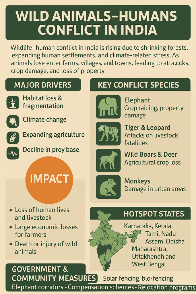 Wildlife–human conflict in India has been rising due to shrinking forests, expanding human settlements, and climate-related stress. As animals lose habitat and food sources, they increasingly enter farms, villages, and towns, leading to attacks, crop damage, and loss of property.