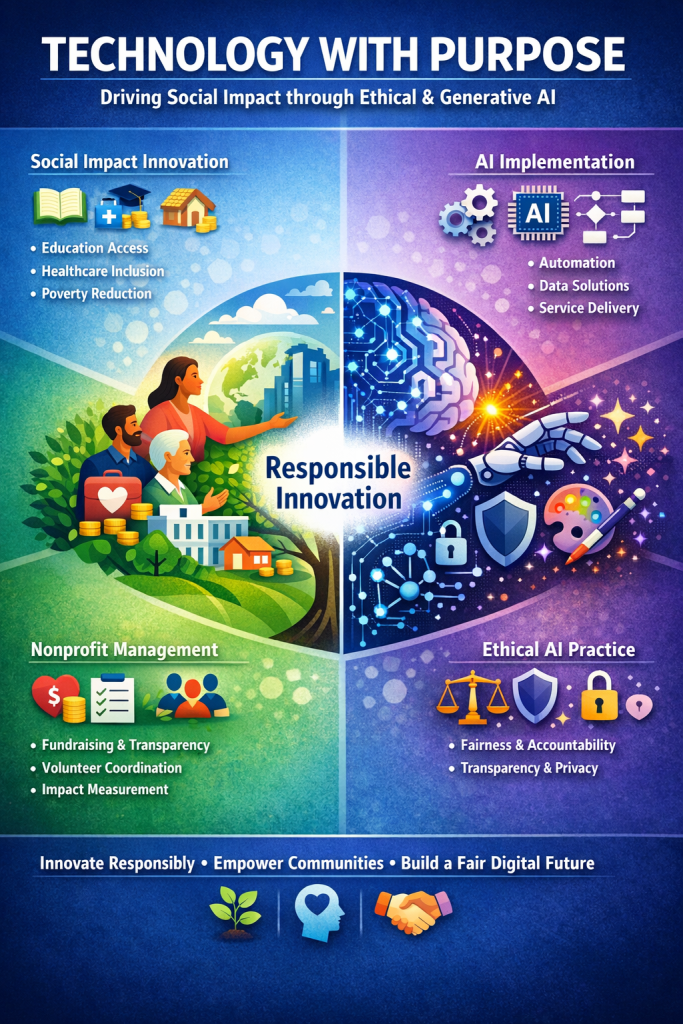 🟩 Central Visual (Core of Poster)A human + AI collaboration graphicOne side: People, communities, nonprofits Other side: AI brain, data streams, creativity Center text: “Responsible Innovation”🟨 Five Connected Sections (Around the Center)