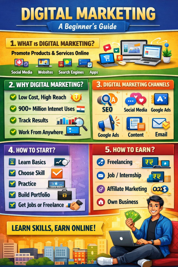 Below is a clear, beginner-friendly explanation of Digital Marketing, step by step, suitable for students, youths, and career starters in India.