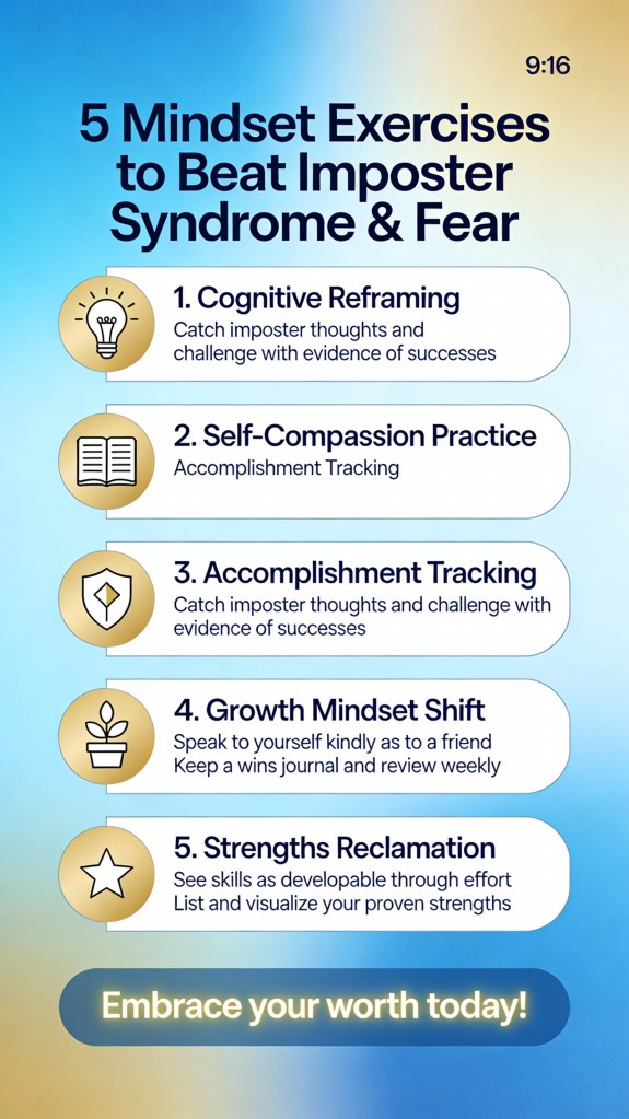 Five mindset exercises can help combat imposter syndrome and associated fears by reframing negative thoughts and building self-awareness. These draw from cognitive behavioral techniques and growth mindset principles commonly recommended by experts. ��