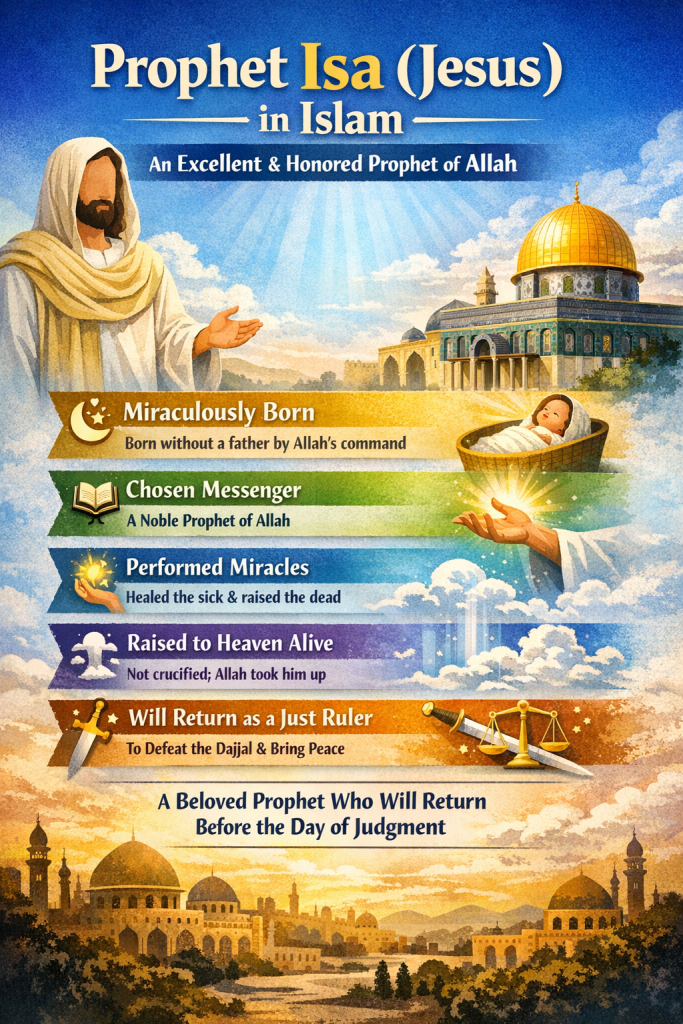 📌 Short Statement to Use Prophet Isa (Jesus) A.S. is an excellent, honored prophet in Islam — born miraculously, chosen by Allah, performed great miracles with Allah’s permission, and will return before the Day of Judgment as a just ruler.