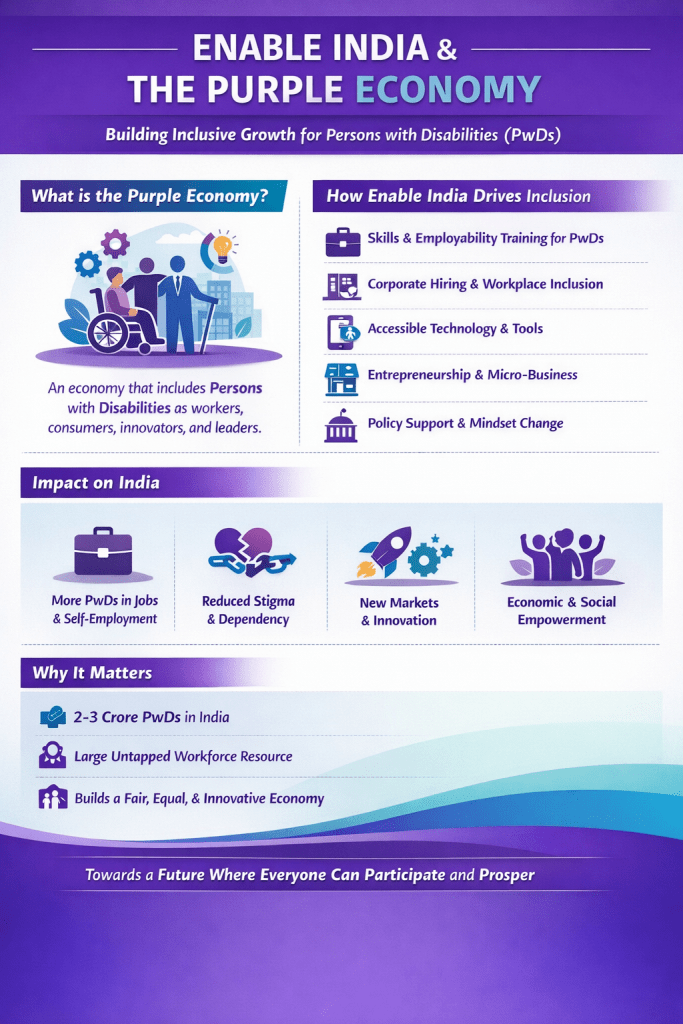 Enable India is one of the most influential organizations working to make the Purple Economy a reality in India. The Purple Economy means an economy that actively includes Persons with Disabilities (PwDs) as workers, entrepreneurs, consumers, and contributors—not just beneficiaries.