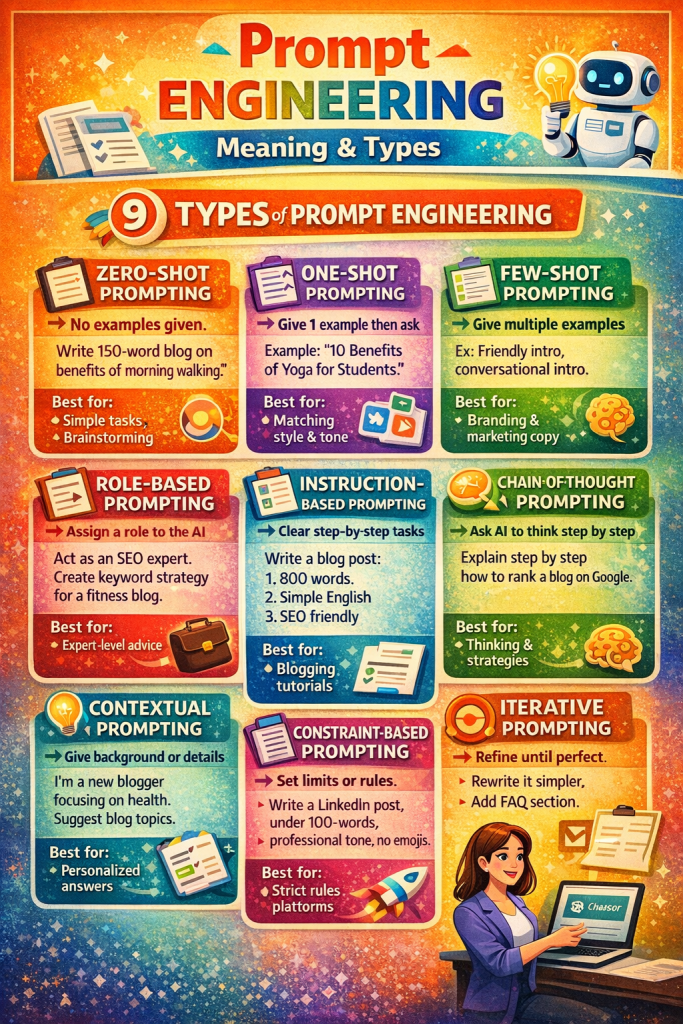 🧠 Prompt Engineering: Meaning & Types (Simple Guide)🔹 What is Prompt Engineering?Prompt Engineering is the skill of writing clear, structured instructions (prompts) so AI tools (like chatbots or image generators) give accurate, useful, and repeatable results.Think of it as how you talk to AI to get the best output.🔸 Why Prompt Engineering Matters Saves time ⏱️Improves accuracy