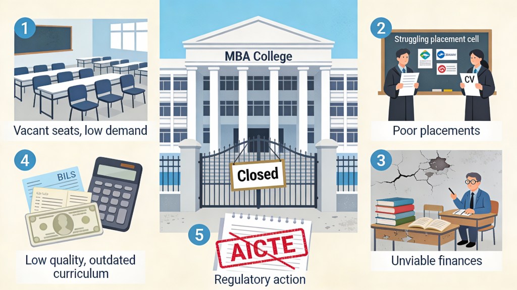 Key structural reasons Excess capacity and vacant seats: In the 2010s, MBA seats expanded rapidly; by 2015–16, B-schools offered around 5.2 lakh MBA seats, but demand did not keep pace.� Large numbers of seats remained unfilled for several years, making it impractical for many institutes to continue.��