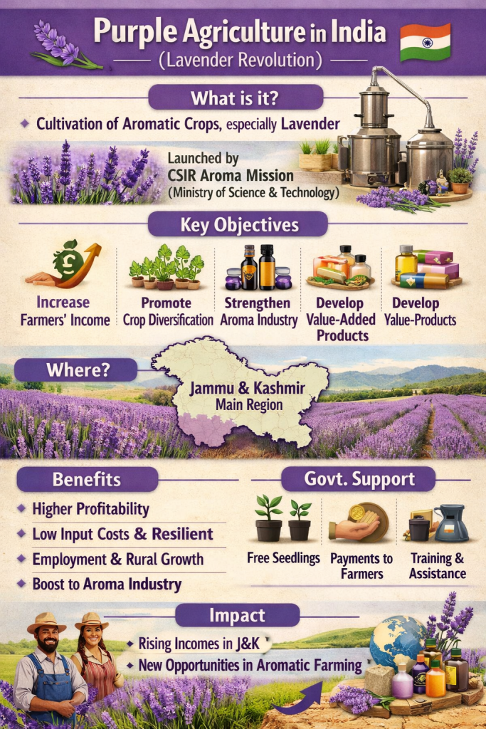 The Purple Revolution in India refers to a government-led agricultural initiative promoting the cultivation of aromatic crops, especially lavender, as a commercially viable alternative to traditional staples. It’s also called the Lavender Revolution. �