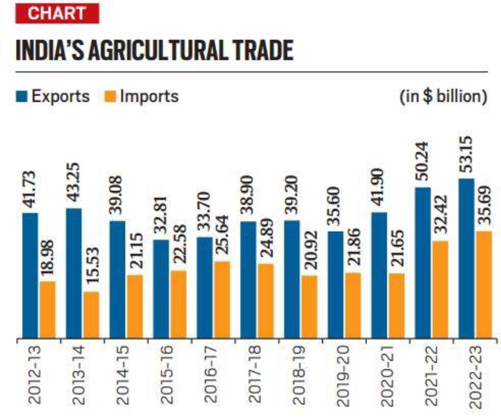 India: agricultural exports rose to about US$48.15 billion in 2023–24 (strong growth from a decade earlier). �