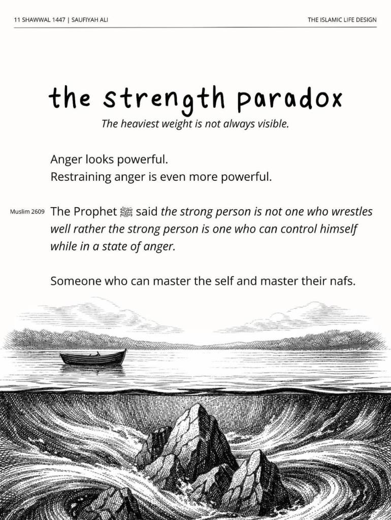 Islam emphasizes mastery over the nafs (inner desires/ego) as true strength.