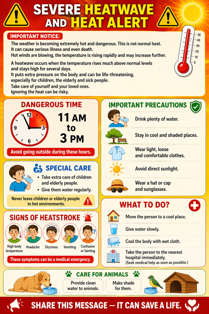 This image is public warning poster about extreme heat (heatwave) and how to stay safe. Here is a clear explanation in English: